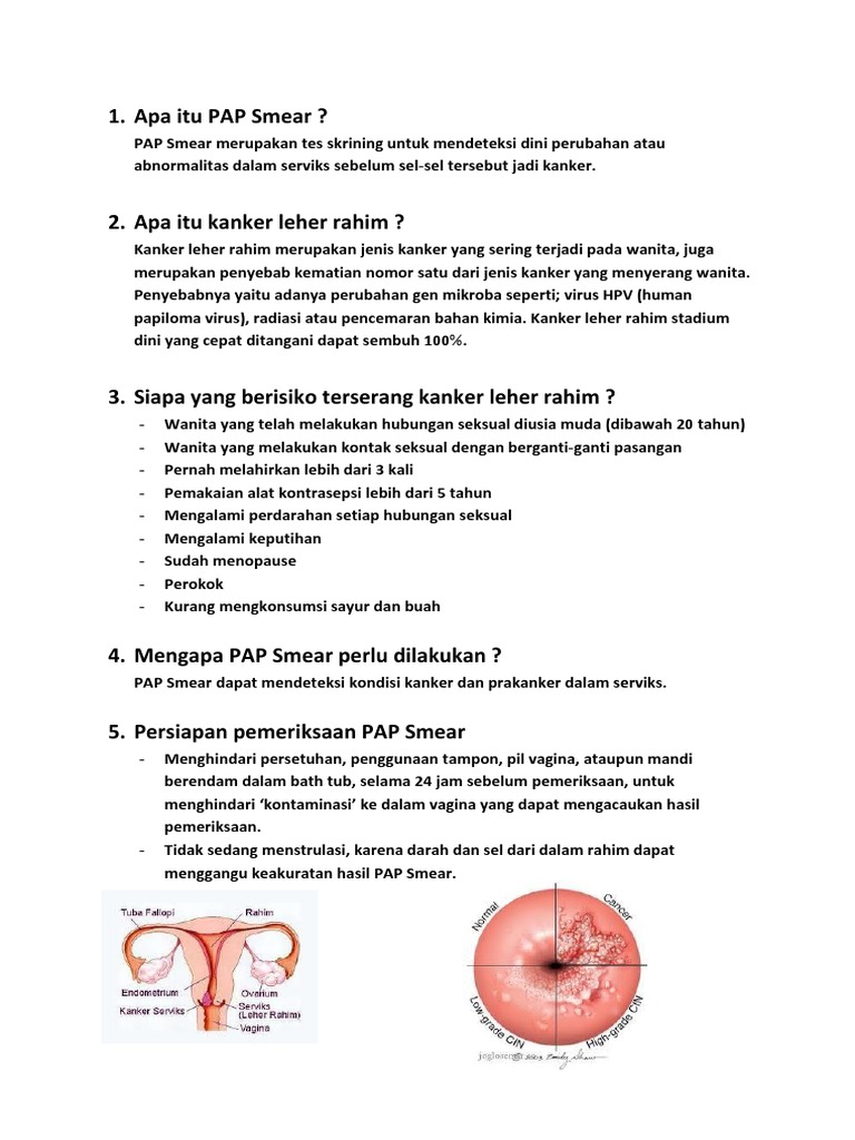 Dalam kebanyakan kasus, pap smear aman dilakukan dalam 24 minggu pertama kehamilan. Savesave apa itu pap smear for later. Berapa biaya pap smear dan apa saja syaratnya? If your pap smear is normal but your hpv test is positive, your doctor will talk to you about possible recommendations. 0 ratings0% found this document useful (0 votes). A pap smear can also detect changes in your cervical cells that suggest cancer may develop in the future. Selain itu, dokter juga dapat menganjurkan agar pemeriksaan dilakukan lebih sering jika pasien memiliki faktor risiko tertentu. Setiap satu jam seorang wanita meninggal karena kanker serviks di indonesia. Lantas, apa dan bagaimana pap smear tersebut? Papsmear merupakan salah satu prosedur pemeriksaan pada leher rahim pada wanita. If you have cancer, finding it early on gives you the best chance of fighting it. Sebelum melakukan pap smear pertama kali, apa saja yang harus dilakukan? Oleh karena itu pencegahan harus dilakukan sedini mungkin agar sel kanker yang berada di serviks atau leher rahim ini bisa segera dideteksi.