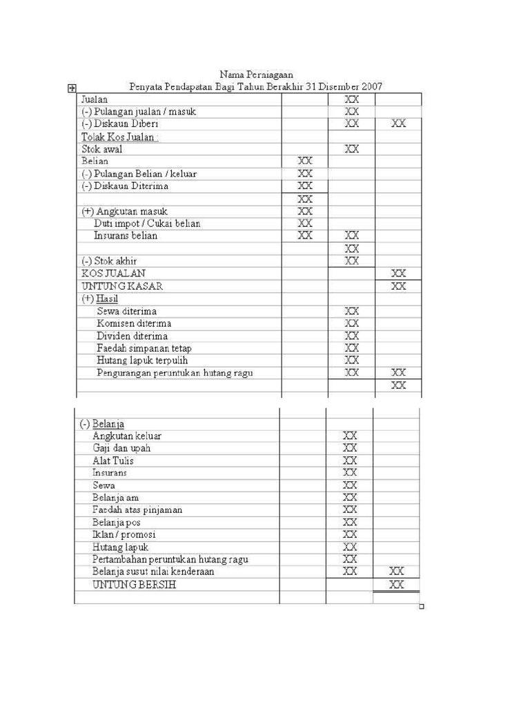 Kami mengumpulkan soal dan jawaban dari tts (teka teki silang) populer yang biasa muncul di koran kompas, jawa pos, koran tempo, dll. Berbeza dengan cf atau p&yang, ia tidak melaporkan ke atas aliran tetapi mencerminkan keadaan syarikat itu pada tarikh laporan. Posted by noor ilyana ibrahim at 08:23. Peniaga nazrol melaburkan rm 12 000 untuk memulakan perniagaan pada 1 november 2001. Lembaran imbangan, atau sebaliknya dipanggil penyataan kedudukan, merupakan bahagian penting penyata kewangan yang menunjukkan penyataan hal ehwal entiti, dari segi apa yang dimiliki perniagaan dan apa yang ia bayar kepada pihak luar dan pemiliknya tarikh tertentu. Akhir tempoh laporan ini, biasanya 31 disember tahun yang. Aset tetap mulai susutnilai bagi tahun pertama, kedua dan ketiga. Sebagai contoh, perniagaan puan ditubuhkan pada 2009 dan kemungkinan perniagaan puan tidak memulakan sebarang operasi, perniagaan puan mungkin beroperasi pada tahun 2012. Penyata kewangan perniagaan other contents: Syarikat membeli $ 2, 000 dalam peralatan secara tunai. Ini mungkin melibatkan mengisi beberapa siri dokumen standard. Ini boleh bermakna sama ada anda mendapat matematik yang salah, atau bahawa perniagaan tidak menyumbang satu atau lebih transaksi. Saya mempunyai akaun berasingan untuk urus niaga perniagaan dengan perbezaan.